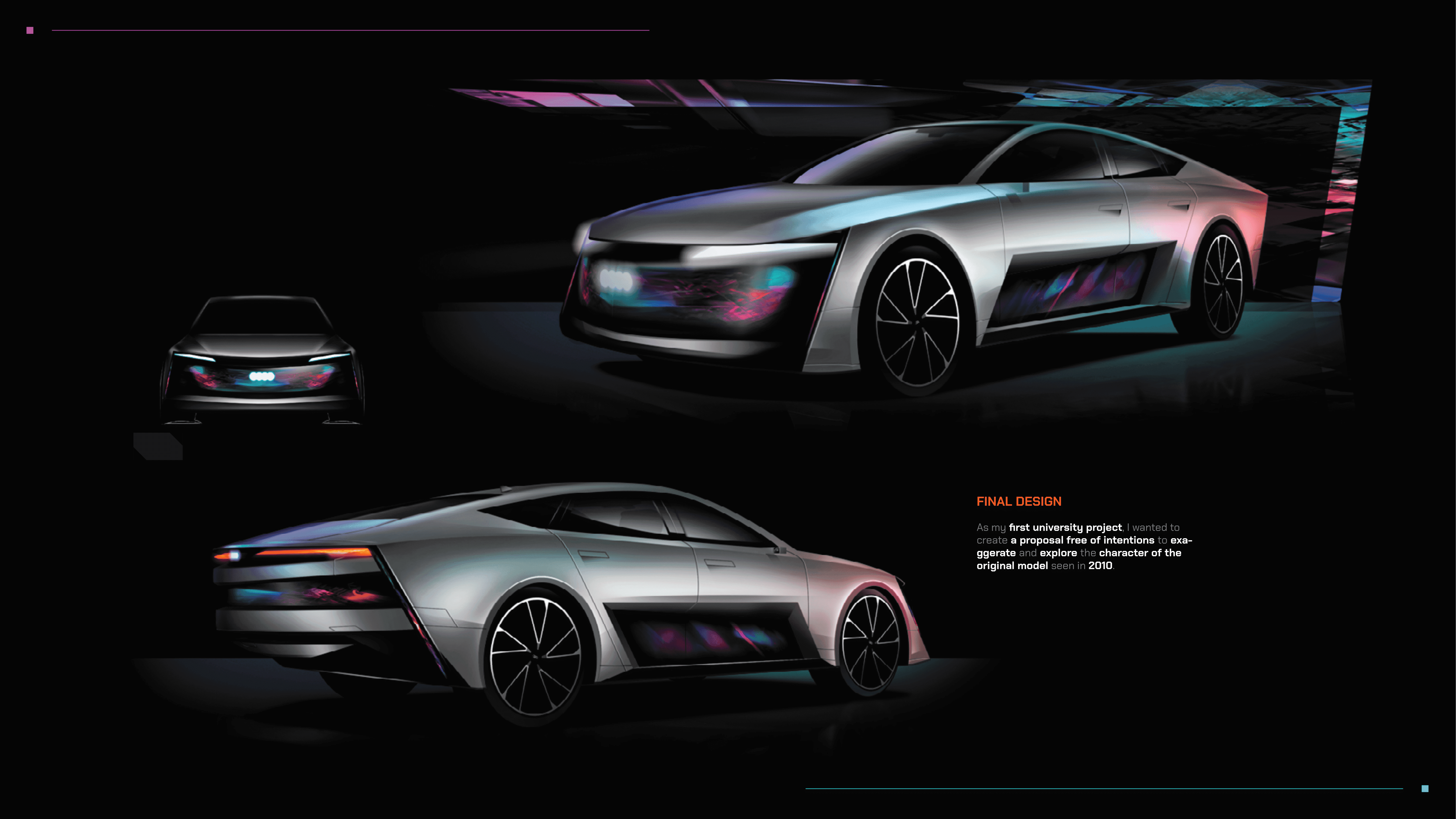 I tend to live dreaming and trying to express through my projects what things and how they resonate with me. Giving a unique soul to objects has always been something really exciting for me. So my goal is to be an illustrator for a big car brand to express its character, sensations, and most primal instinct thanks to color, graphics, shapes and aesthetics. Nice to meet you ^^